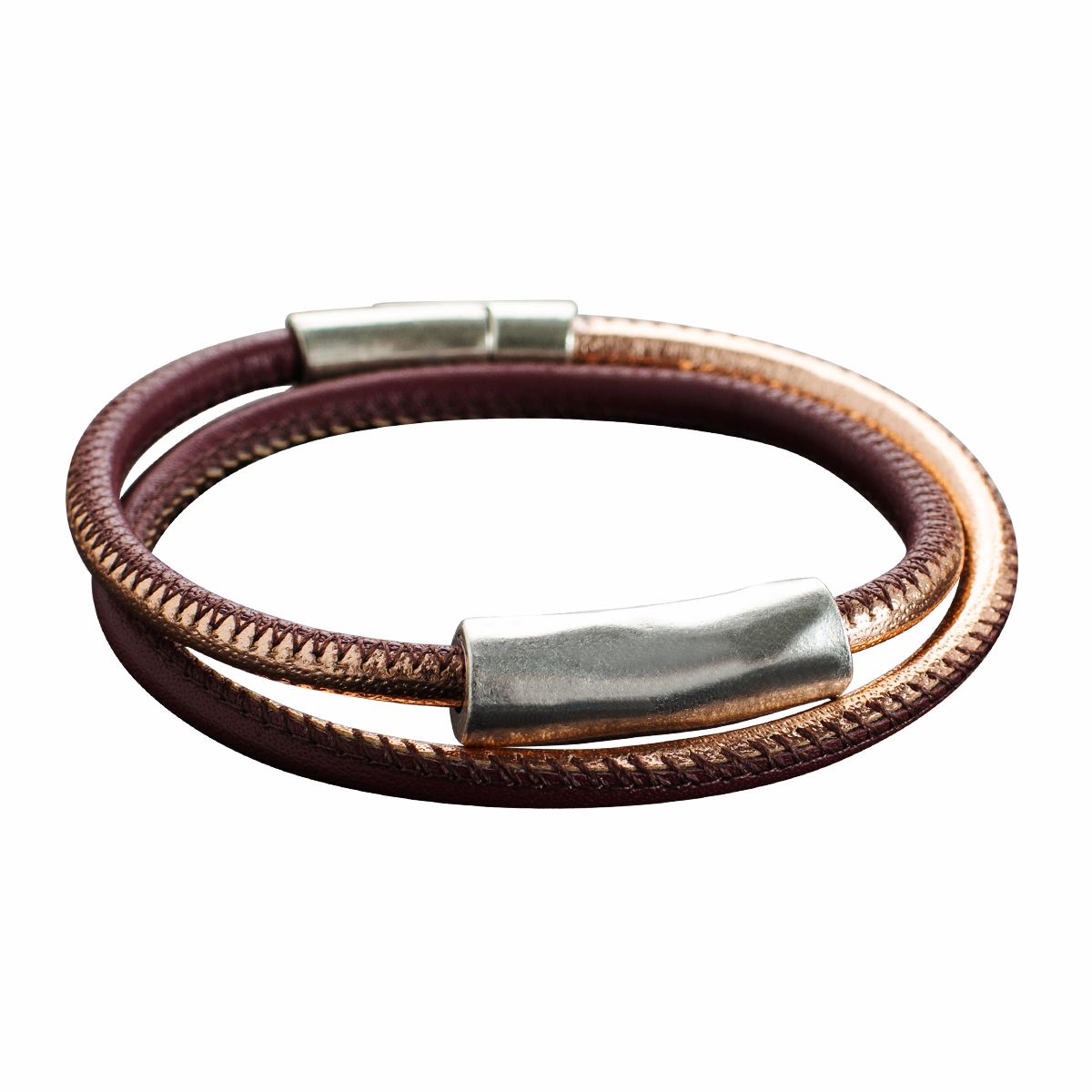 Dieses aus feinem Kalbsleder gefertigte Armband erlangt seine außergewöhnliche Schönheit durch die exakte Zick-Zack-Naht: sie verbindet die beiden unterschiedlichen Lederfarben, setzt farbliche Akzente und sorgte für die verspielte Note dieses Armbands. Mittelteil aus aus versilbertem Zamak/ Magnetverschluss.