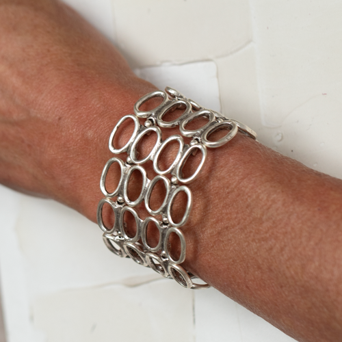 Armreif in Altsilber-Optik, Grundmaterial: feine Zinklegierung, nickelfrei, oberflächenveredelt durch eine Echtsilber Plattierung. Breite 40 mm