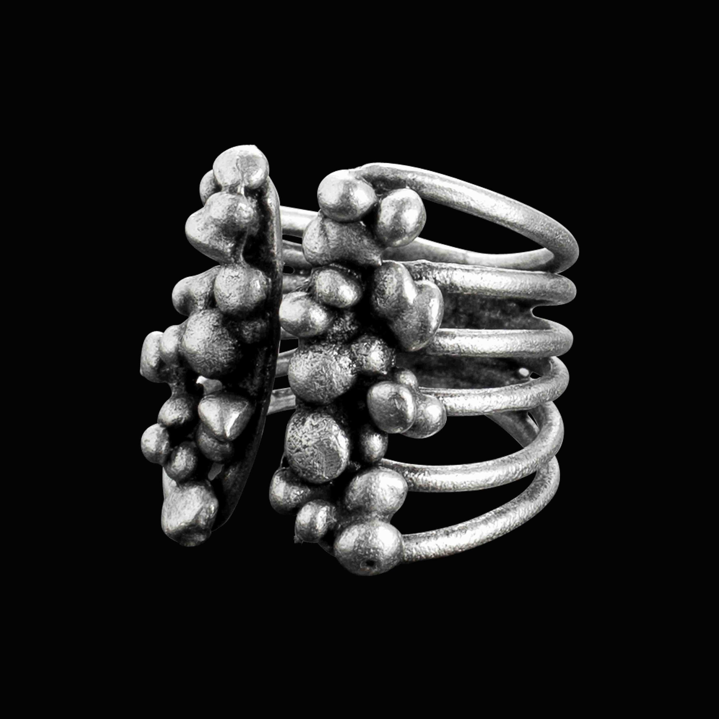 Grundmaterial: Messing, nickelfrei, oberflächenveredelt durch eine Echtsilber Plattierung. Ringbasis offen, größenvariabel. Maße: L 23 mm, B 20 mm