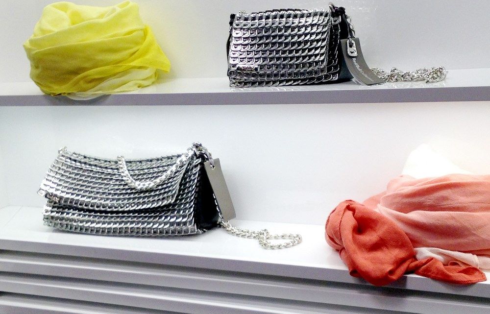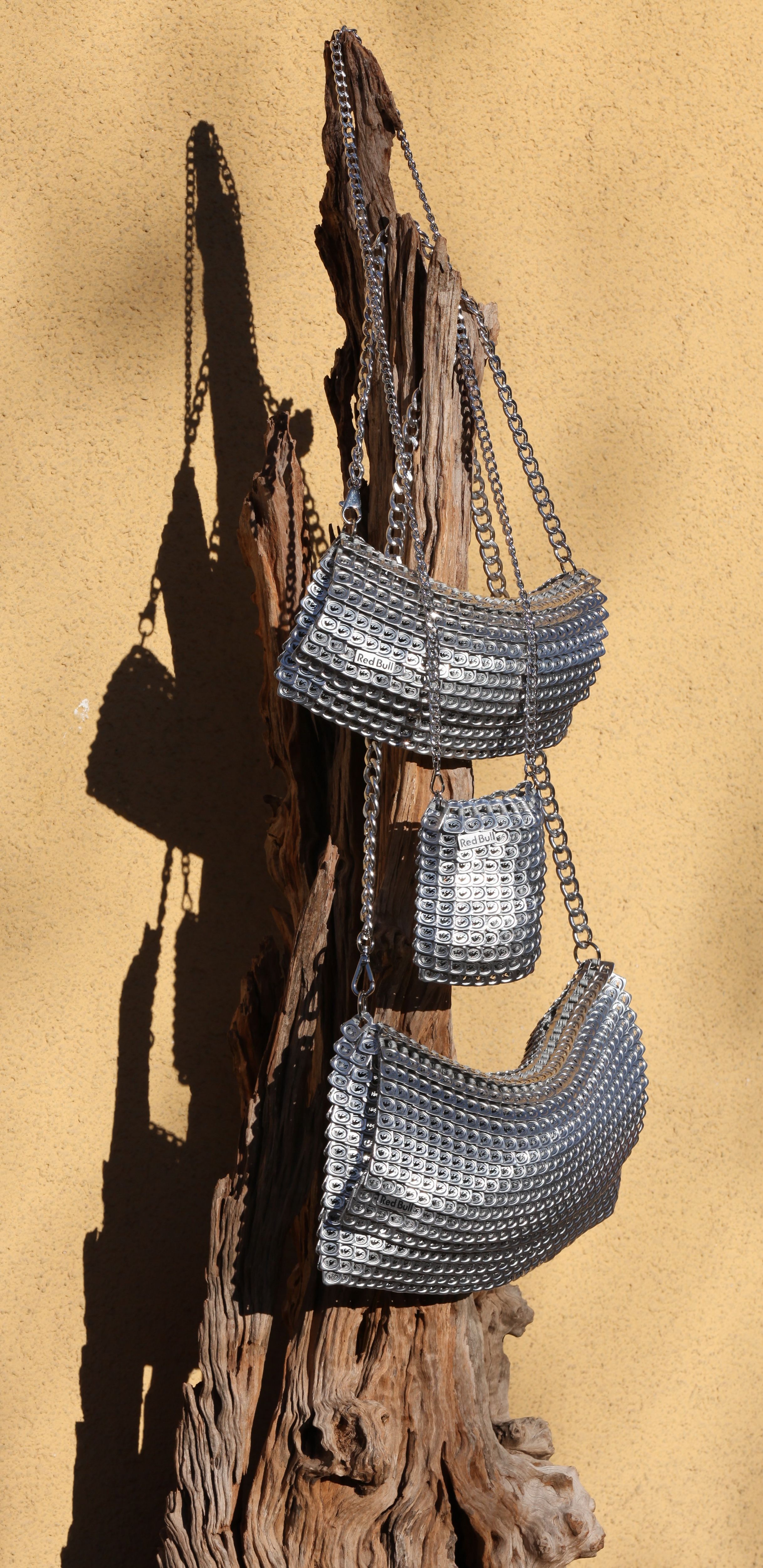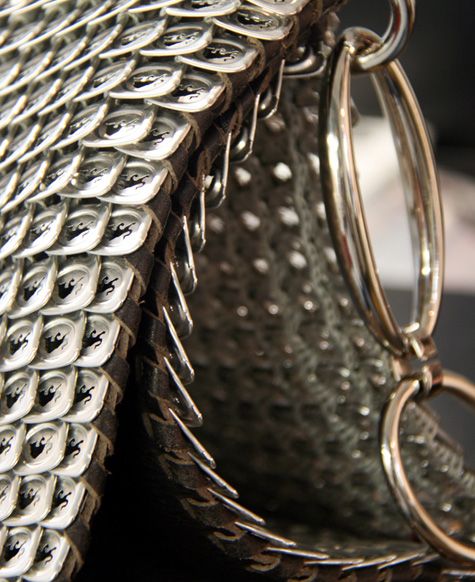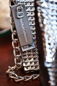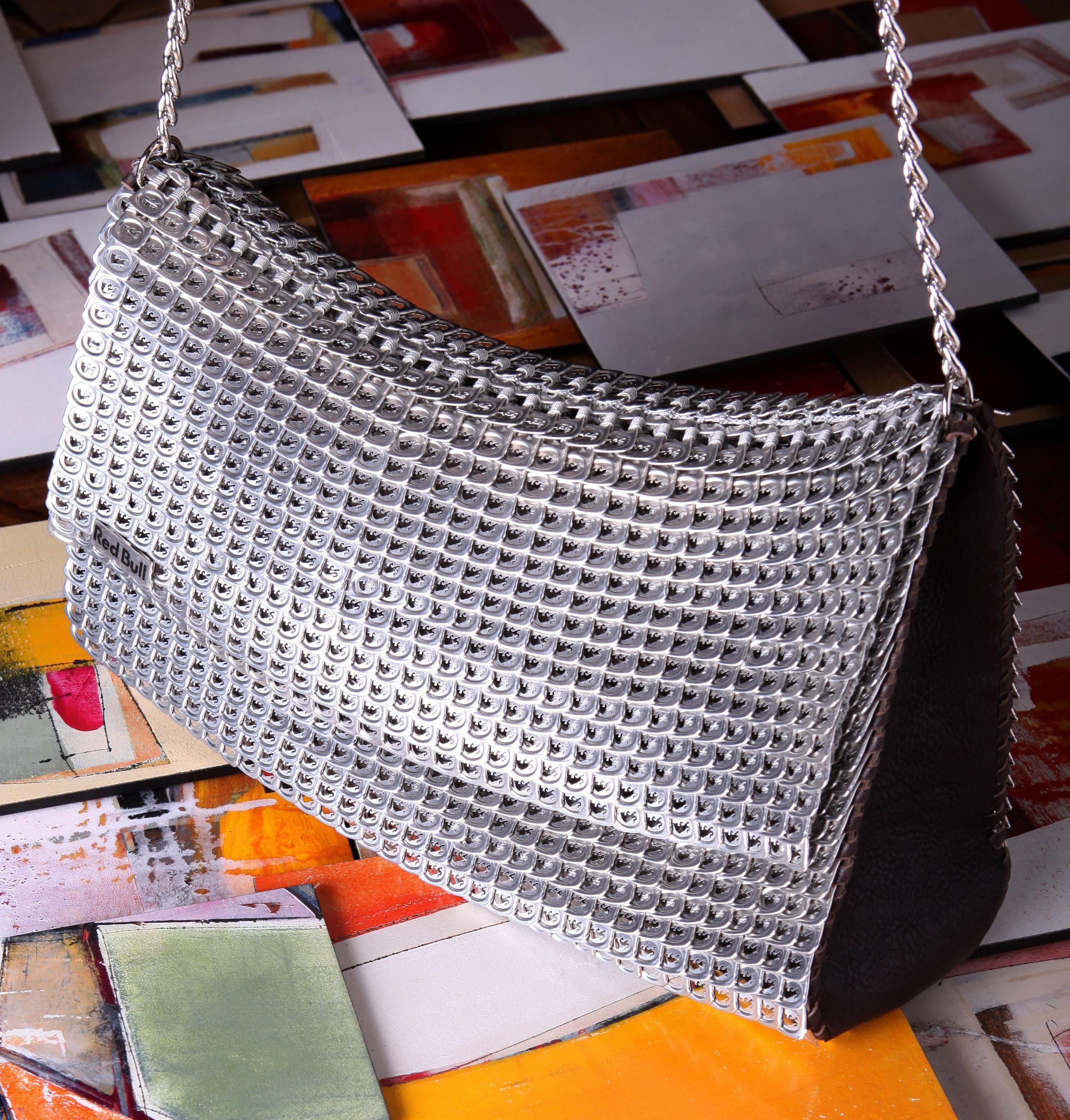 IN EDLEM SILBER GEHALTEN, ERGEBEN DIE ANEINANDERGEHÄKELTEN DOSENRINGE ECHTER RED BULL DOSEN EINEN EXKLUSIVEN, GLAMOURÖSEN LOOK. DIE TASCHENKOLLEKTION VON ROBERTO LEONARDI IST EXKLUSIV IN DEN Stores der RED BULL WORLD ERHÄLTLICH.