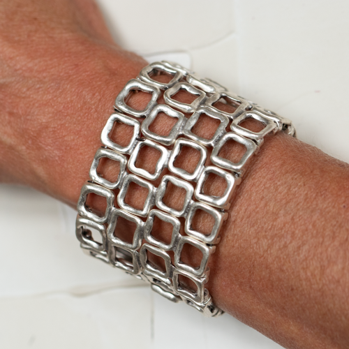 Armreif in Altsilber-Optik, Grundmaterial: feine Zinklegierung, nickelfrei, oberflächenveredelt durch eine Echtsilber Plattierung. Breite 60 mm