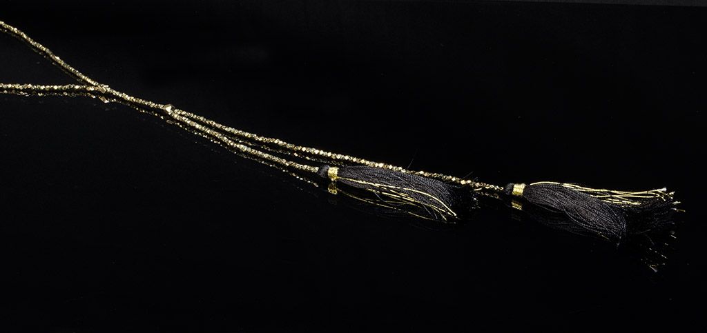 Grundmaterial: Legierung, nickel-, cadmium- und bleifrei mit edler antik-goldfarbener Beschichtung, kombiniert mit schwarzen Textilquasten, auf Baumwollband mit Knopfverschluss, sorgfältig von Hand gearbeitet, aus unserer Modeschmucklinie SAADIA - ein attraktives Accessoire zum modernen Outfit
