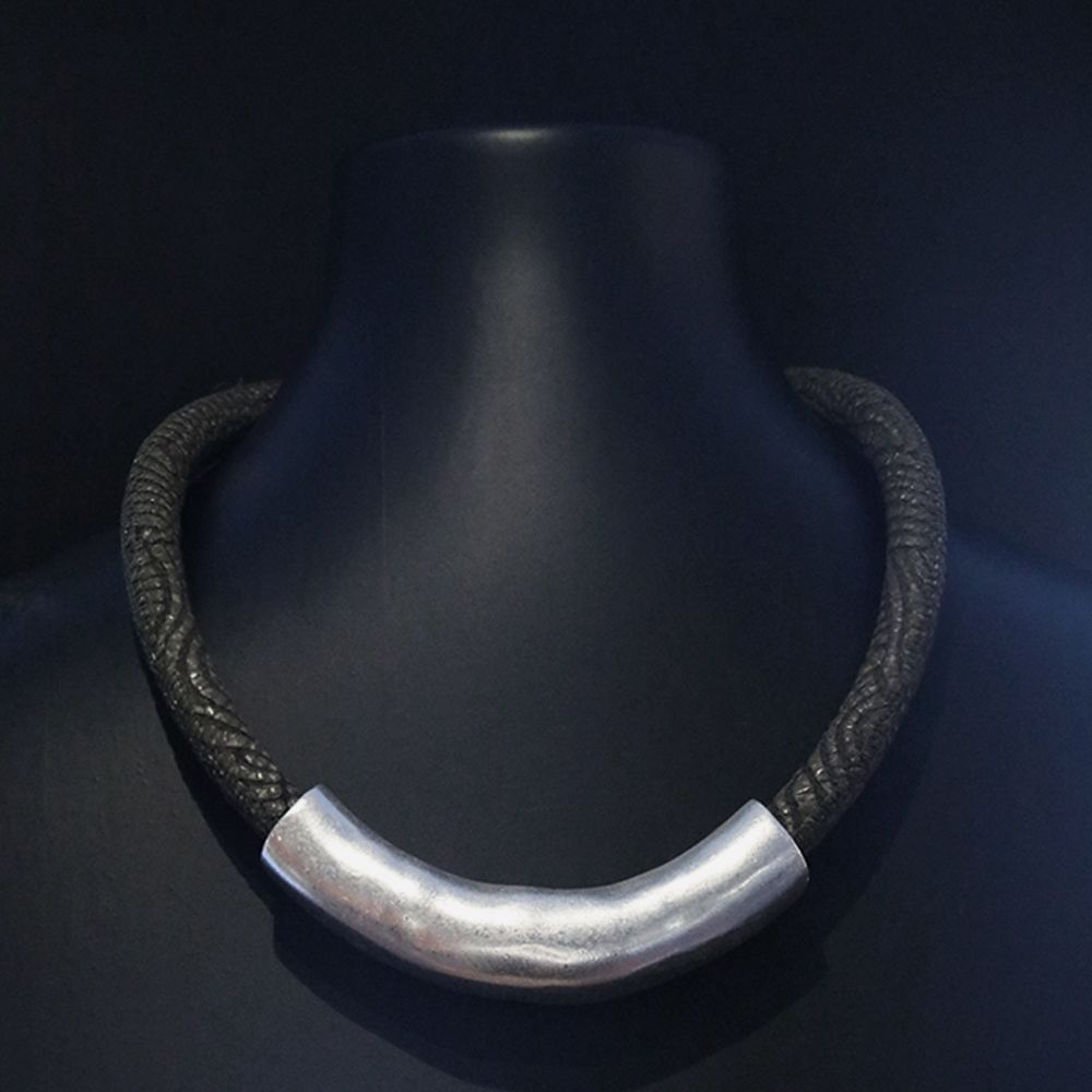 Necklace in antique silver look on an exclusive leather strap. Base material: fine zinc alloy, nickel-free, surface-finished with real silver plating, embossed goatskin leather strap available in various colours, colour: military