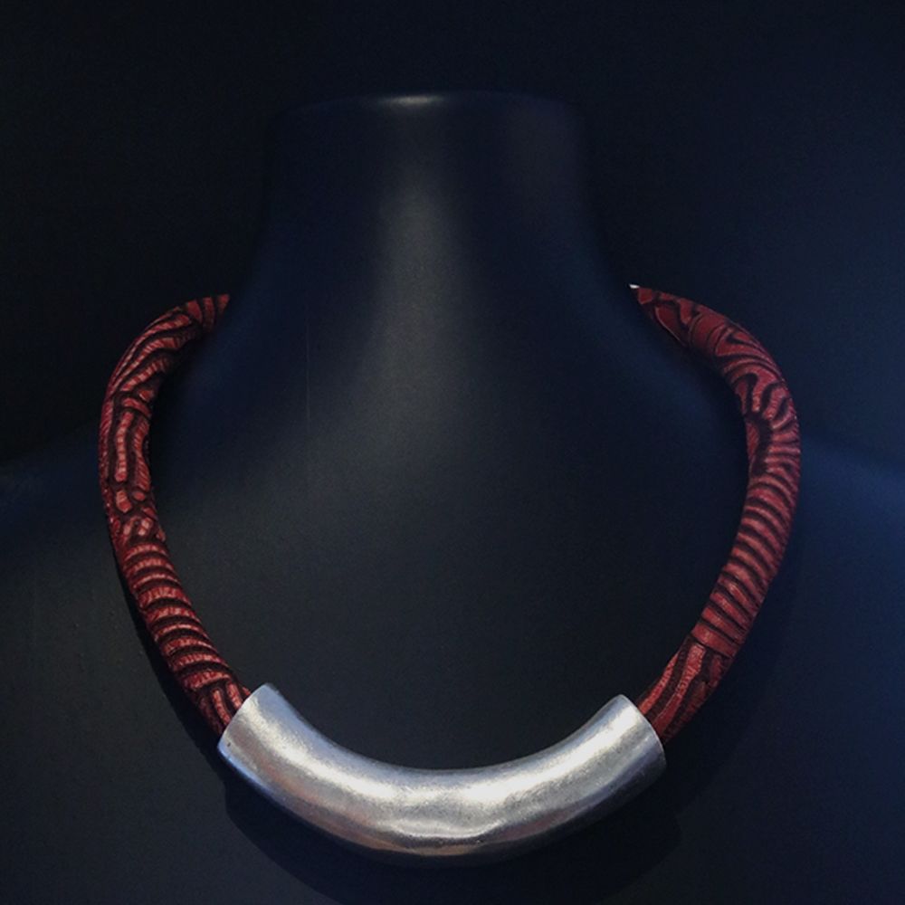 Necklace in antique silver look on an exclusive leather strap. Base material: fine zinc alloy, nickel-free, surface-finished with real silver plating, embossed goatskin leather strap available in various colours, colour: rosso